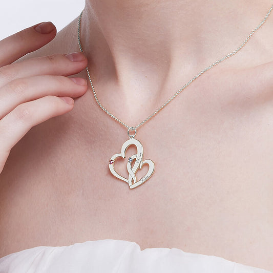Interlocking Two-Heart Necklace with Names & Birthstones