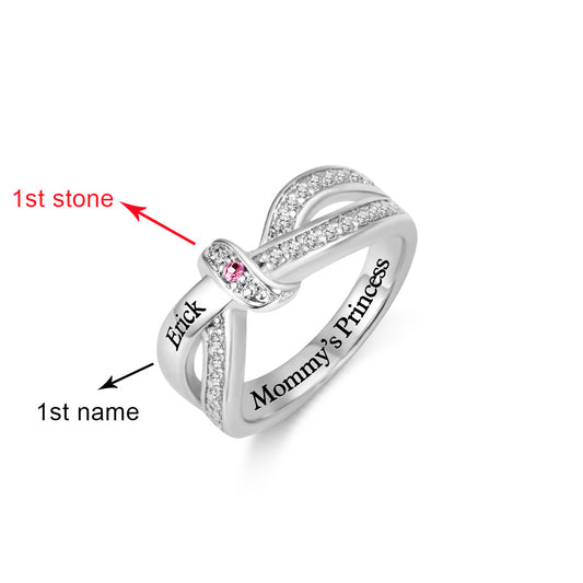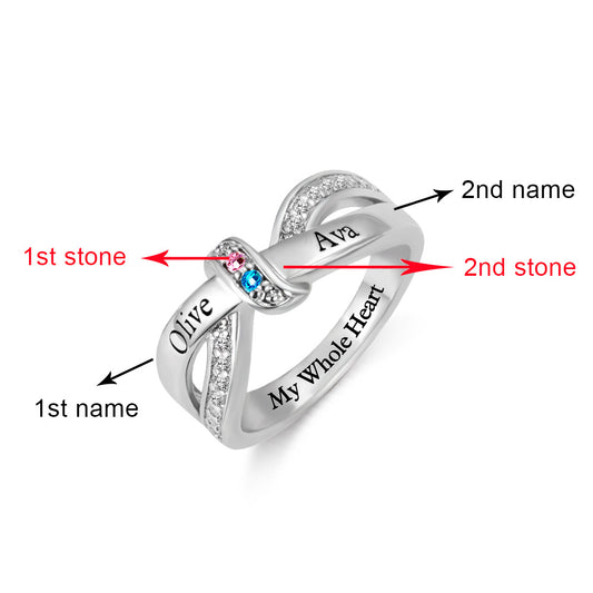Engraved 2 Names and Birthstones Ribbon Ring with Easy to Read Font