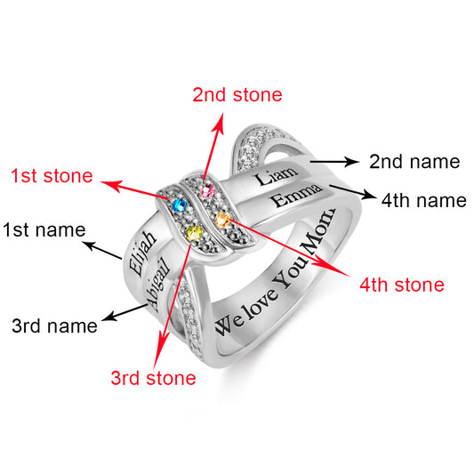 Engraved 4 Names and Birthstones Ribbon Ring with Easy to Read Font