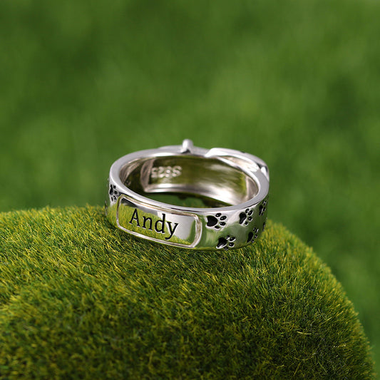 Engraved Pet Collar Ring with Footprint in Silver