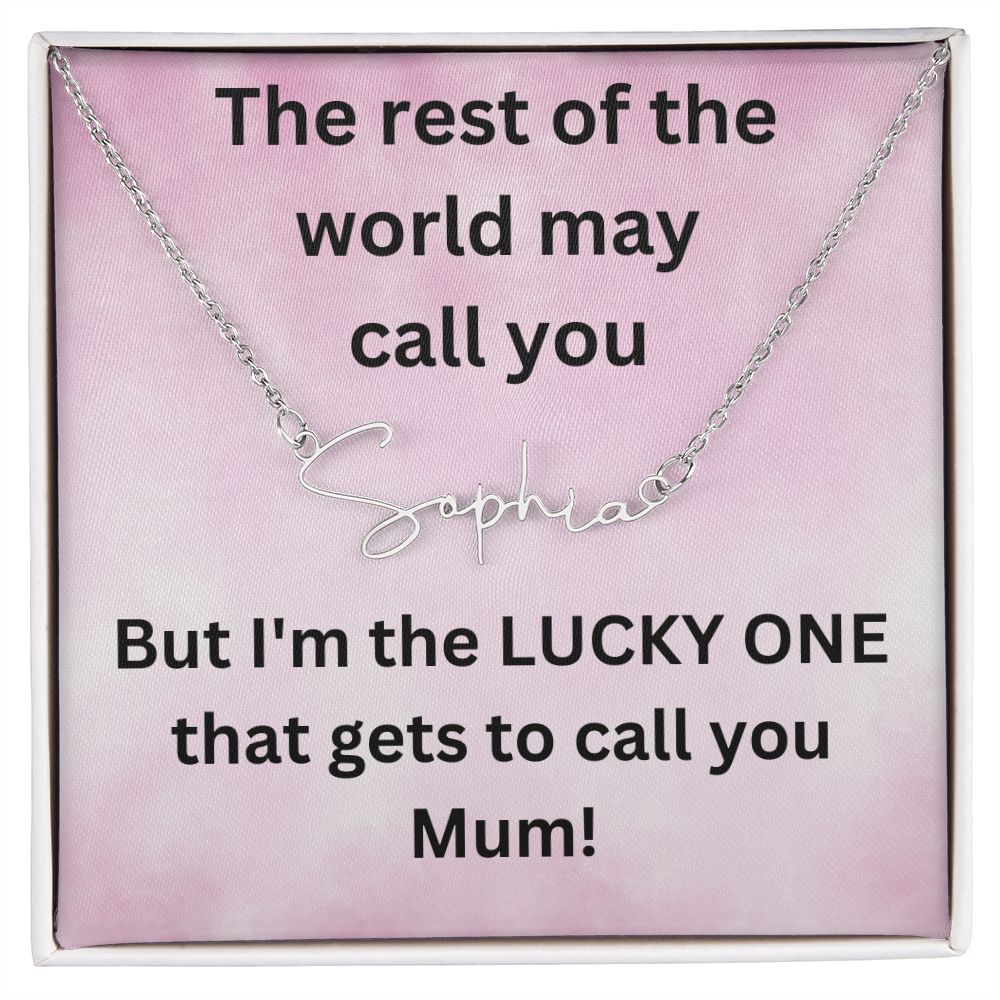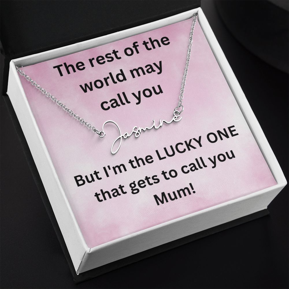 But I'm the LUCKY ONE that gets to call you Mum! Pink background (Signature Name Necklace)