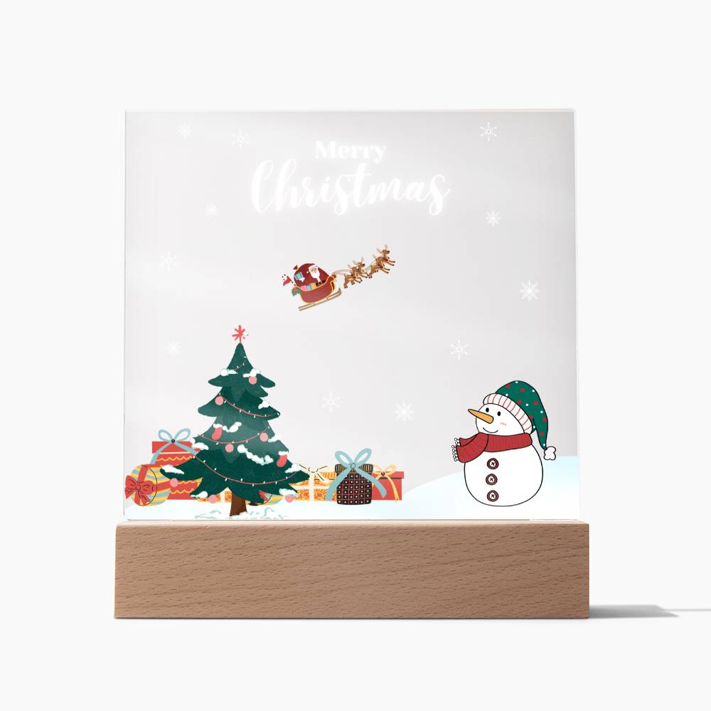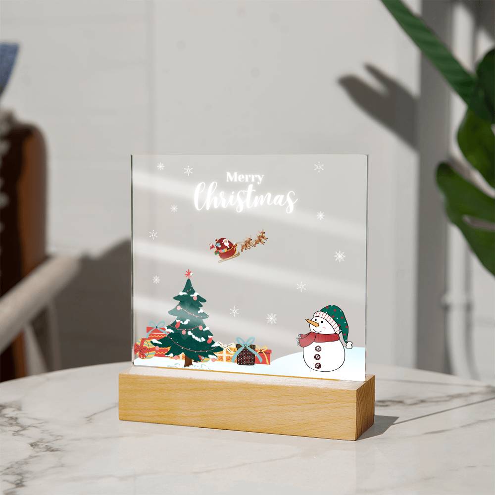 Elevate your Christmas décor with our Square Acrylic Plaque adorned with a heartwarming snow scene. Delight in the sight of a cheerful snowman, Santa Claus, and his airborne reindeer, all beautifully depicted against a snowy backdrop. This enchanting scene comes to life even more when displayed on the included Wooden LED Base, casting a warm and festive glow that adds a touch of magic to your holiday ambiance.