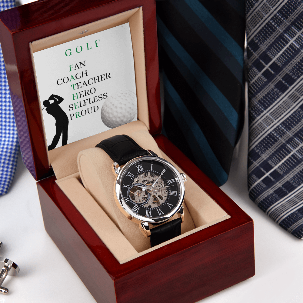 Give the gift of luxury with this handsome and daring timepiece. The Men's Openwork Watch is the perfect blend of classic design and modern styling, making it an essential accessory for your remarkable style. This watch sports a genuine leather strap, is splash resistant, and has increased durability thanks to hardened mineral glass. Our unique skeleton dial feature allows you to peer directly into the inner workings of your watch. Beautifully crafted to be automatic, this watch requires motion instead of batteries. You will keep precise time simply by wearing it, no winding necessary. This magnificent piece makes the perfect gift for yourself or any man in your life looking to add a tasteful element into his wardrobe.