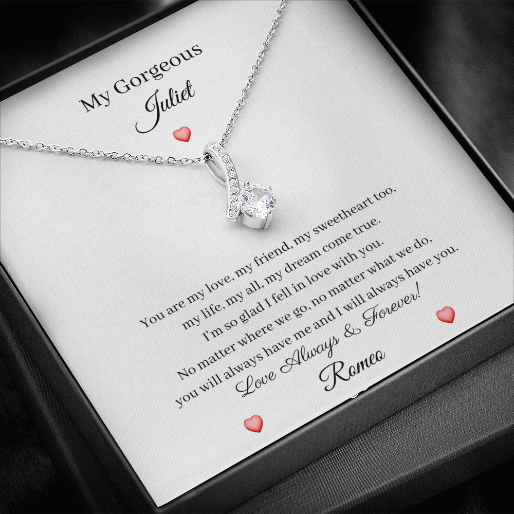 Imagine her reaction when she opens this stunning gift! The Alluring Beauty necklace features a petite ribbon-shaped pendant that is sure to dazzle your special someone. Whether it's a birthday or anniversary, make sure to get her a gift she will love for years to come.