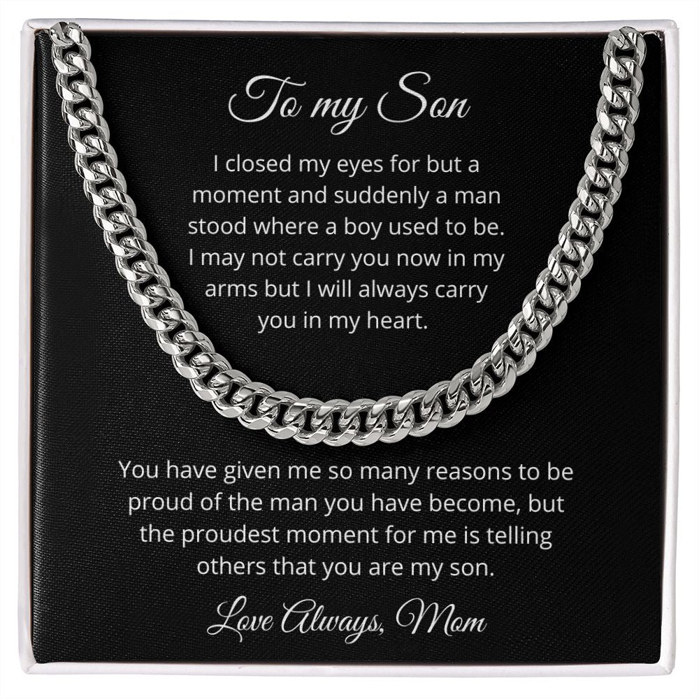To my Son - Suddenly a man stood where a boy used to be - Mom (black back) (Cuban Link Chain Necklace)