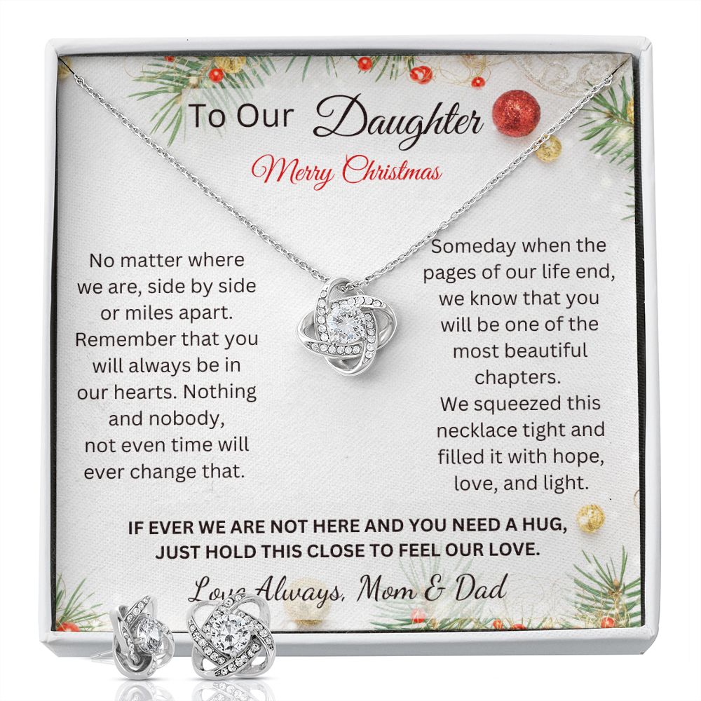 To Our Daughter - Merry Christmas - Just hold this close to feel our love - Love Always, Mom & Dad (Love Knot necklace and earrings set)