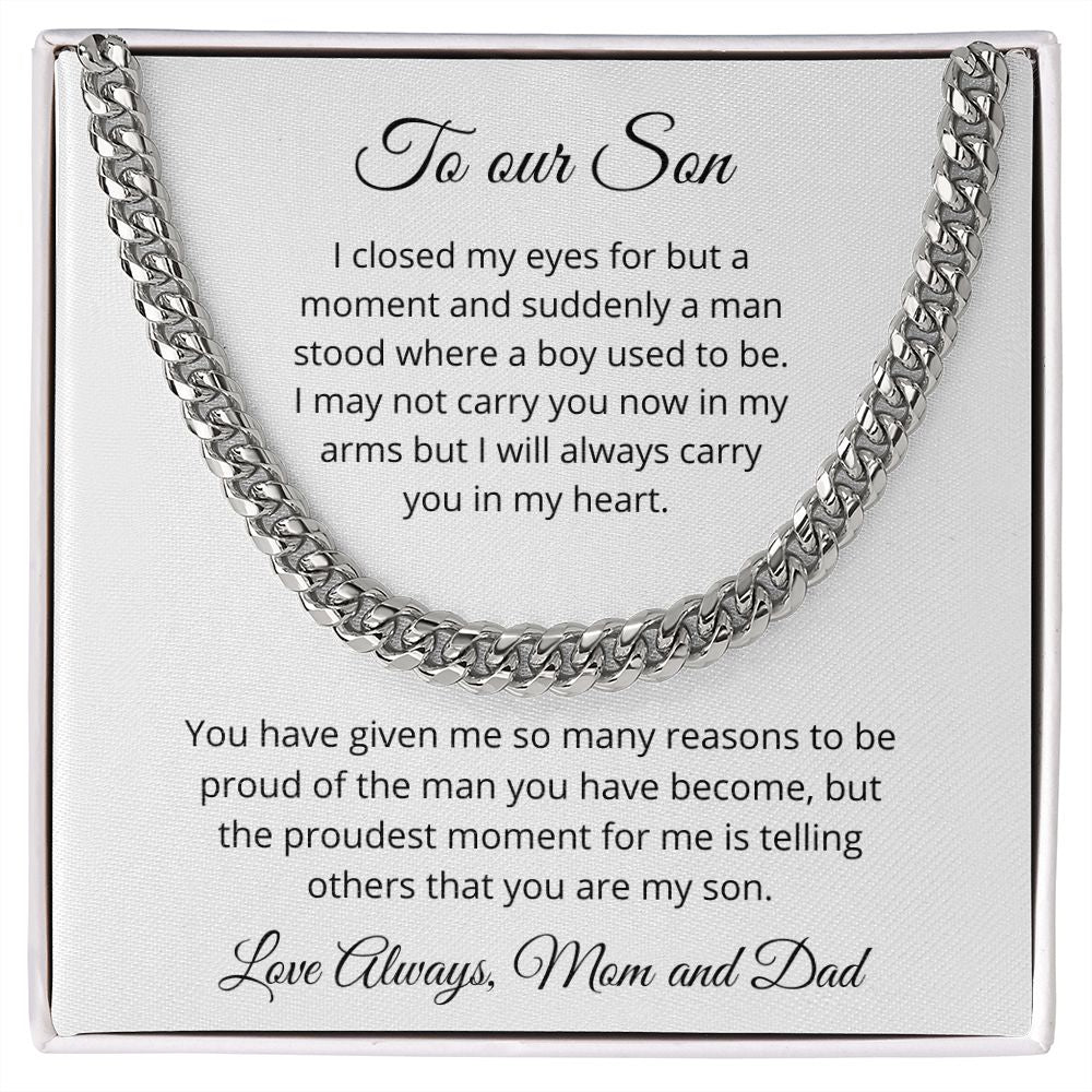 To our Son - Suddenly a man stood where a boy used to be - Mom and Dad (Cuban Link chain)